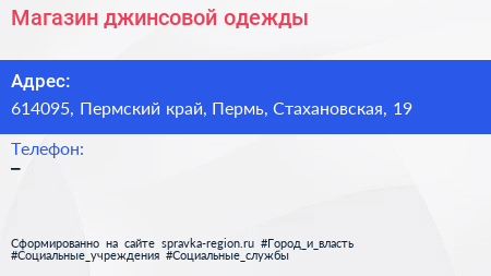 Магазин джинсовой одежды по адресу 614095, Пермский край, Пермь, Стахановская, 19 в дальнейшем Организация, размещена в следующих категориях:
