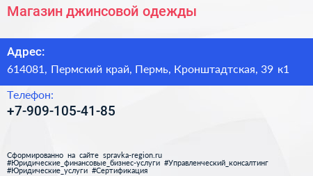 Магазин джинсовой одежды по адресу 614081, Пермский край, Пермь, Кронштадтская, 39 к1 в дальнейшем Организация, размещена в следующих категориях: