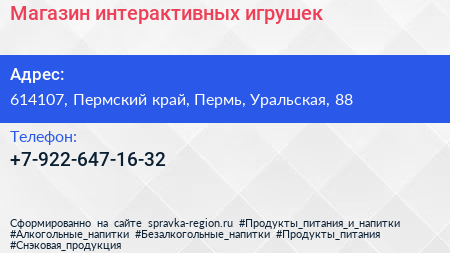 Магазин интерактивных игрушек по адресу 614107, Пермский край, Пермь, Уральская, 88 в дальнейшем Организация, размещена в следующих категориях: