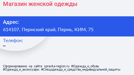 Магазин женской одежды по адресу 614107, Пермский край, Пермь, КИМ, 75 в дальнейшем Организация, размещена в следующих категориях: