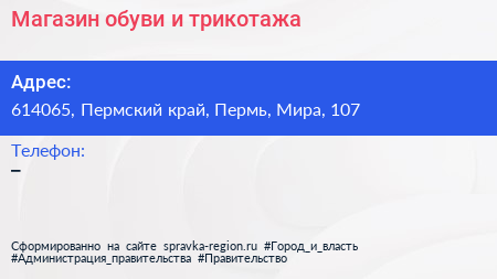 Магазин обуви и трикотажа по адресу 614065, Пермский край, Пермь, Мира, 107 в дальнейшем Организация, размещена в следующих категориях: