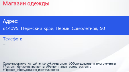 Магазин одежды по адресу 614095, Пермский край, Пермь, Самолётная, 50 в дальнейшем Организация, размещена в следующих категориях: