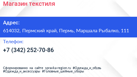 Магазин текстиля по адресу 614032, Пермский край, Пермь, Маршала Рыбалко, 111 в дальнейшем Организация, размещена в следующих категориях: