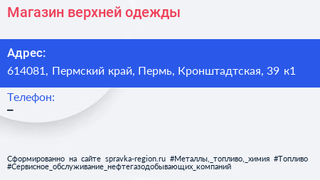 Магазин верхней одежды по адресу 614081, Пермский край, Пермь, Кронштадтская, 39 к1 в дальнейшем Организация, размещена в следующих категориях: