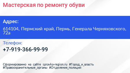 Мастерская по ремонту обуви по адресу 614104, Пермский край, Пермь, Генерала Черняховского, 72а в дальнейшем Организация, размещена в следующих категориях: