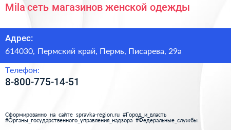 Mila, сеть магазинов женской одежды по адресу 614030, Пермский край, Пермь, Писарева, 29а в дальнейшем Организация, размещена в следующих категориях: