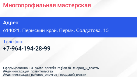 Многопрофильная мастерская по адресу 614021, Пермский край, Пермь, Солдатова, 15 в дальнейшем Организация, размещена в следующих категориях:
