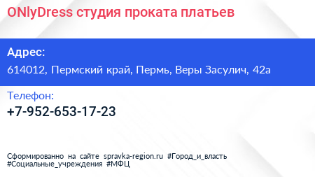 ONlyDress, студия проката платьев по адресу 614012, Пермский край, Пермь, Веры Засулич, 42а в дальнейшем Организация, размещена в следующих категориях: