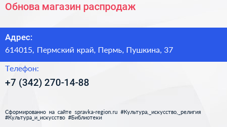 Обнова, магазин распродаж по адресу 614015, Пермский край, Пермь, Пушкина, 37 в дальнейшем Организация, размещена в следующих категориях: