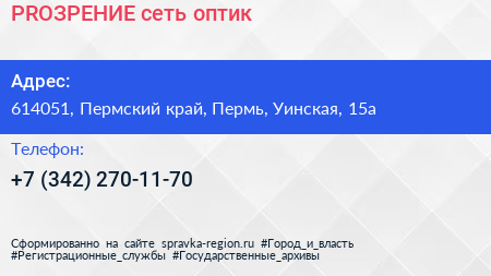PROЗРЕНИЕ, сеть оптик по адресу 614051, Пермский край, Пермь, Уинская, 15а в дальнейшем Организация, размещена в следующих категориях: