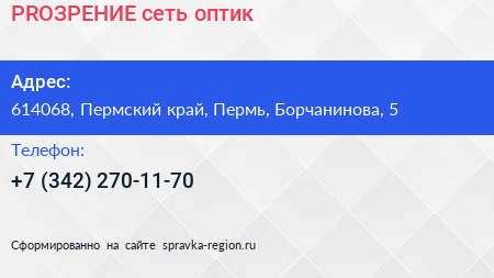 PROЗРЕНИЕ, сеть оптик по адресу 614068, Пермский край, Пермь, Борчанинова, 5 в дальнейшем Организация, размещена в следующих категориях: