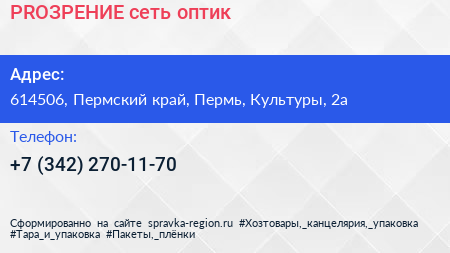 PROЗРЕНИЕ, сеть оптик по адресу 614506, Пермский край, Пермь, Культуры, 2а в дальнейшем Организация, размещена в следующих категориях: