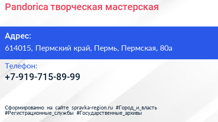 Pandorica, творческая мастерская по адресу 614015, Пермский край, Пермь, Пермская, 80а в дальнейшем Организация, размещена в следующих категориях: