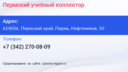 Пермский учебный коллектор по адресу 614036, Пермский край, Пермь, Нефтяников, 50 в дальнейшем Организация, размещена в следующих категориях: