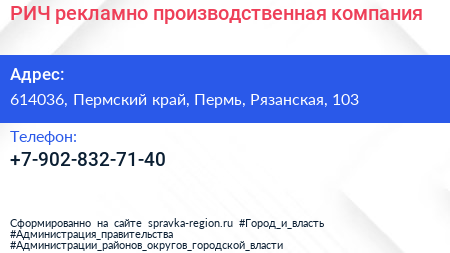 РИЧ, рекламно-производственная компания по адресу 614036, Пермский край, Пермь, Рязанская, 103 в дальнейшем Организация, размещена в следующих категориях:
