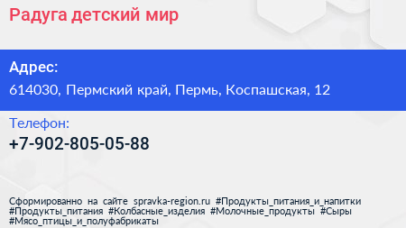 Радуга, детский мир по адресу 614030, Пермский край, Пермь, Коспашская, 12 в дальнейшем Организация, размещена в следующих категориях: