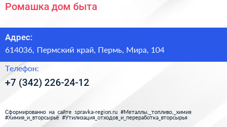 Ромашка, дом быта по адресу 614036, Пермский край, Пермь, Мира, 104 в дальнейшем Организация, размещена в следующих категориях: