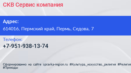 СКВ-Сервис, компания по адресу 614016, Пермский край, Пермь, Седова, 7 в дальнейшем Организация, размещена в следующих категориях: