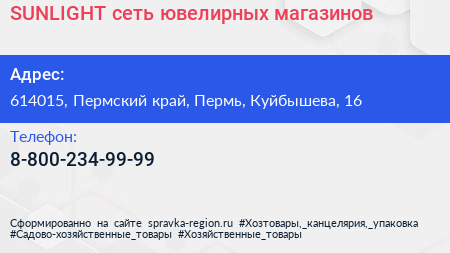 SUNLIGHT, сеть ювелирных магазинов по адресу 614015, Пермский край, Пермь, Куйбышева, 16 в дальнейшем Организация, размещена в следующих категориях: