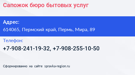 Сапожок, бюро бытовых услуг по адресу 614065, Пермский край, Пермь, Мира, 89 в дальнейшем Организация, размещена в следующих категориях: