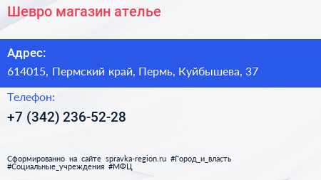 Шевро, магазин-ателье по адресу 614015, Пермский край, Пермь, Куйбышева, 37 в дальнейшем Организация, размещена в следующих категориях: