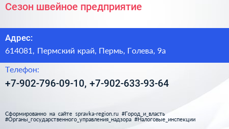 Сезон, швейное предприятие по адресу 614081, Пермский край, Пермь, Голева, 9а в дальнейшем Организация, размещена в следующих категориях: