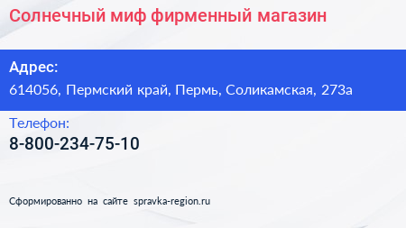 Солнечный миф, фирменный магазин по адресу 614056, Пермский край, Пермь, Соликамская, 273а в дальнейшем Организация, размещена в следующих категориях: