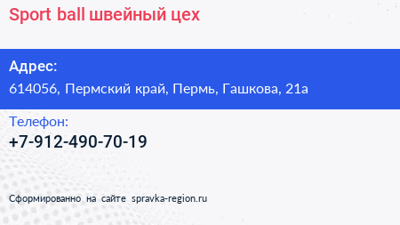Sport-ball, швейный цех по адресу 614056, Пермский край, Пермь, Гашкова, 21а в дальнейшем Организация, размещена в следующих категориях:
