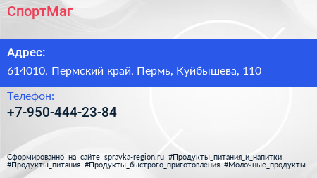 СпортМаг по адресу 614010, Пермский край, Пермь, Куйбышева, 110 в дальнейшем Организация, размещена в следующих категориях: