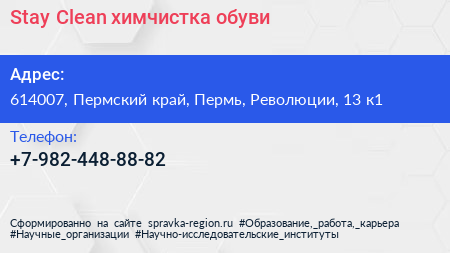 Stay Clean, химчистка обуви по адресу 614007, Пермский край, Пермь, Революции, 13 к1 в дальнейшем Организация, размещена в следующих категориях: