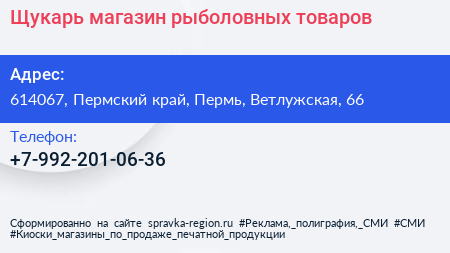 Щукарь, магазин рыболовных товаров по адресу 614067, Пермский край, Пермь, Ветлужская, 66 в дальнейшем Организация, размещена в следующих категориях: