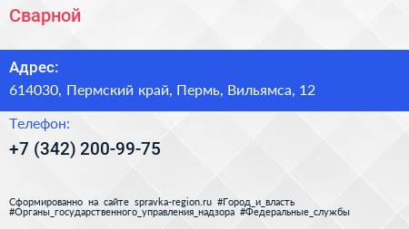 Сварной по адресу 614030, Пермский край, Пермь, Вильямса, 12 в дальнейшем Организация, размещена в следующих категориях: