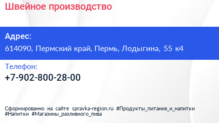 Швейное производство по адресу 614090, Пермский край, Пермь, Лодыгина, 55 к4 в дальнейшем Организация, размещена в следующих категориях: