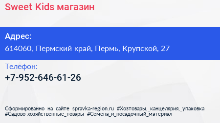 Sweet Kids, магазин по адресу 614060, Пермский край, Пермь, Крупской, 27 в дальнейшем Организация, размещена в следующих категориях: