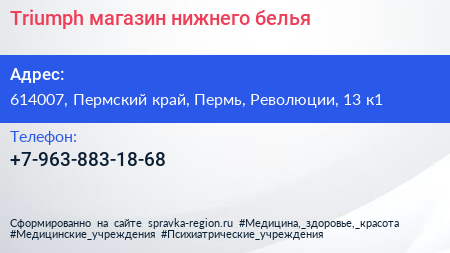 Triumph, магазин нижнего белья по адресу 614007, Пермский край, Пермь, Революции, 13 к1 в дальнейшем Организация, размещена в следующих категориях: