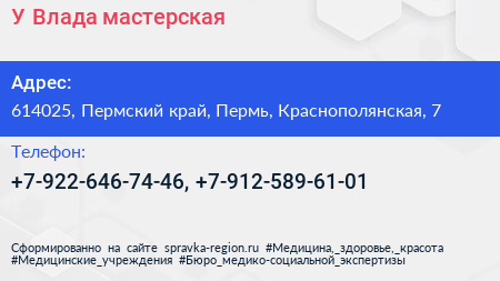 У Влада, мастерская по адресу 614025, Пермский край, Пермь, Краснополянская, 7 в дальнейшем Организация, размещена в следующих категориях: