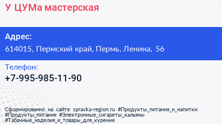 У ЦУМа, мастерская по адресу 614015, Пермский край, Пермь, Ленина, 56 в дальнейшем Организация, размещена в следующих категориях: