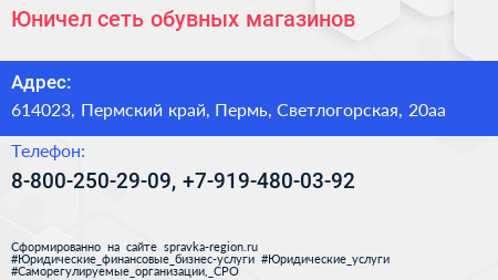 Юничел, сеть обувных магазинов по адресу 614023, Пермский край, Пермь, Светлогорская, 20аа в дальнейшем Организация, размещена в следующих категориях: