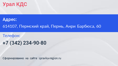 Урал КДС по адресу 614107, Пермский край, Пермь, Анри Барбюса, 60 в дальнейшем Организация, размещена в следующих категориях: