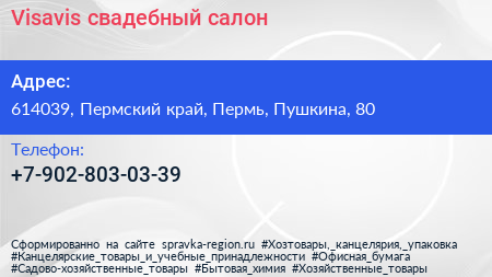 Visavis, свадебный салон по адресу 614039, Пермский край, Пермь, Пушкина, 80 в дальнейшем Организация, размещена в следующих категориях:
