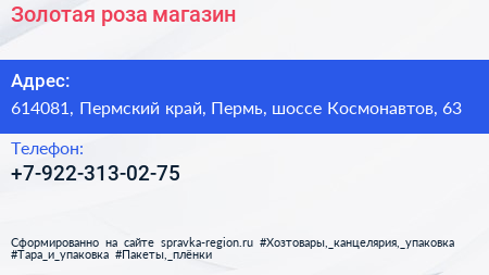 Золотая роза, магазин по адресу 614081, Пермский край, Пермь, шоссе Космонавтов, 63 в дальнейшем Организация, размещена в следующих категориях: