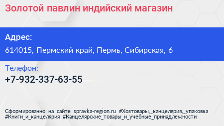 Золотой павлин, индийский магазин по адресу 614015, Пермский край, Пермь, Сибирская, 6 в дальнейшем Организация, размещена в следующих категориях: