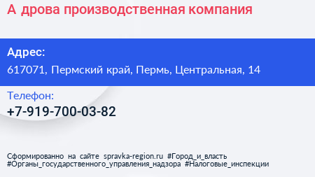 А-дрова, производственная компания по адресу 617071, Пермский край, Пермь, Центральная, 14 в дальнейшем Организация, размещена в следующих категориях: