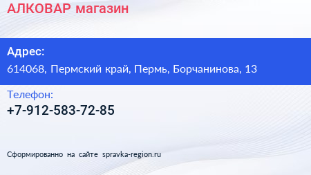АЛКОВАР, магазин по адресу 614068, Пермский край, Пермь, Борчанинова, 13 в дальнейшем Организация, размещена в следующих категориях: