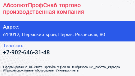 АбсолютПрофСнаб, торгово-производственная компания по адресу 614012, Пермский край, Пермь, Рязанская, 80 в дальнейшем Организация, размещена в следующих категориях: