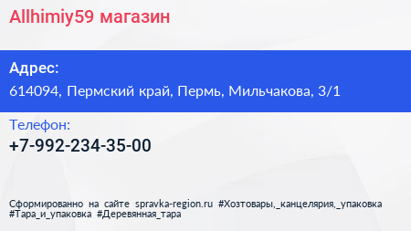 Allhimiy59, магазин по адресу 614094, Пермский край, Пермь, Мильчакова, 3/1 в дальнейшем Организация, размещена в следующих категориях: