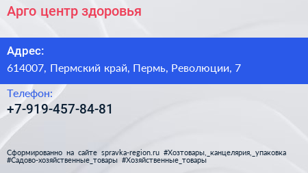 Арго, центр здоровья по адресу 614007, Пермский край, Пермь, Революции, 7 в дальнейшем Организация, размещена в следующих категориях: