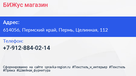 БИЖус, магазин по адресу 614056, Пермский край, Пермь, Целинная, 112 в дальнейшем Организация, размещена в следующих категориях: