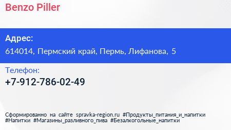 Benzo Piller по адресу 614014, Пермский край, Пермь, Лифанова, 5 в дальнейшем Организация, размещена в следующих категориях: