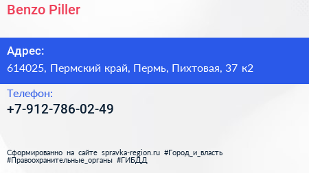 Benzo Piller по адресу 614025, Пермский край, Пермь, Пихтовая, 37 к2 в дальнейшем Организация, размещена в следующих категориях: